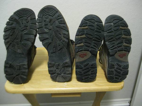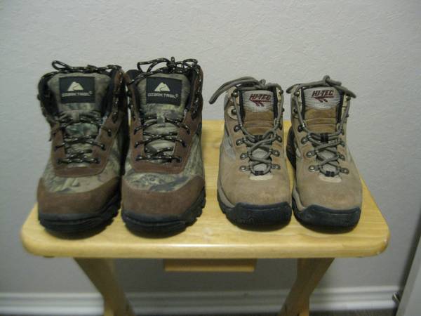 Men's size 9 1/2 OZARK TRAIL Hiking Boots: $25.00 Ladies size 7 HI-TEC Hiking Boots: $15.00 Pay less for each if you buy both pairs for $35.00. These have been used very minimally. These boots are in better than very good condition. We are in our 80s and don't hike as well as we remember we used to. Our loss, your gain. The posted phone number is a hardline phone. It DOES NOT TEXT. email or call with a message and a number and I'll return your call the same day. Thanks, Phil