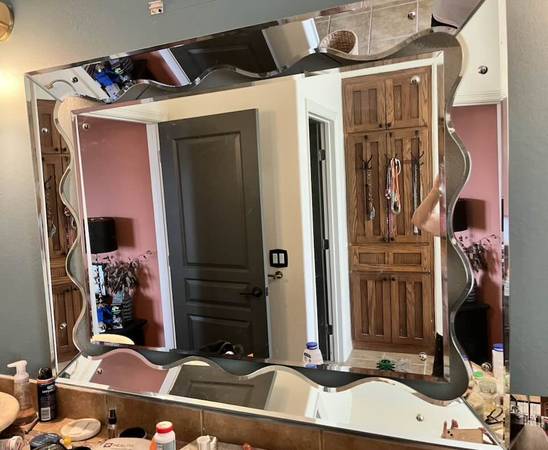 Beautiful mid-century beveled wall mirror. 48 1/2 inches wide and 36 1/2 inches "tall" Has small chip in one corner. Heavy and should be handled with care.
