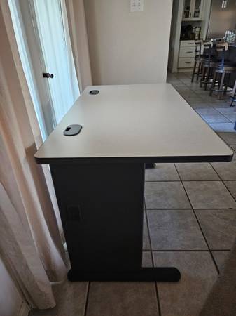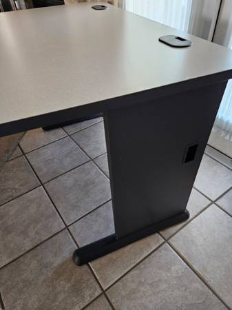 Lightly used, very solid computer table desk, grey tone, tray to hold wires underneath 47.5" wide 27" depth 30" high