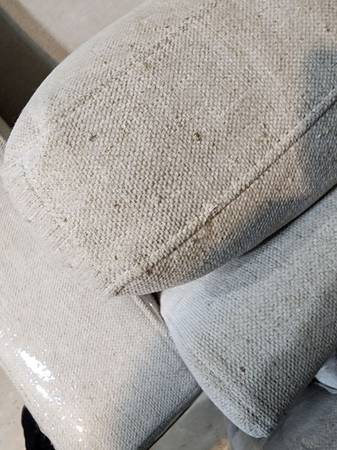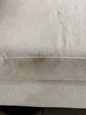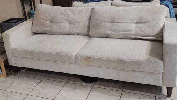 Need gone ASAP! 3 seater beige/off white couch; about 1.5 years old; good condition - small thread pulls from normal wear & tear, 1 light stain on front side of 1 cushion (soda), would probably...