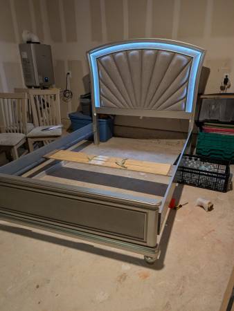 Best offer. I put bed together to show led lighting. I bought the bedroom set from rooms to go. You can Google it and see reviews and dimensions. Still in box. Bought as a package so it was cheaper than buying it separately. Has led lighting on headboard and a lot of bling. Only needs a mattress, box spring is your choice. Includes headboard, footboard and rails. I included pics of end table and dresser to show the led and bling but are not included in the sale.